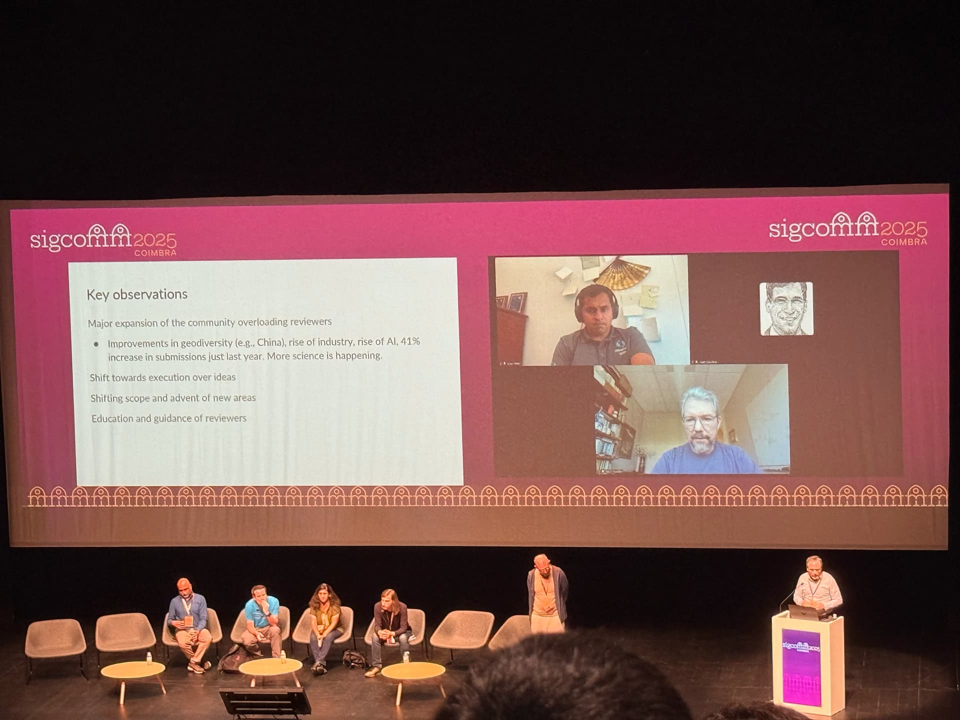 Introduction This panel is a community discussion focused on improving reviewing practices at SIGCOMM. Building on earlier conference reforms—such as non-paper sessions and dual tracks that were well-received—the community is now turning its attention to the quality and scalability of the review process. The motivation comes from the growing number of paper submissions, the rising pressure on program committees, and concerns about maintaining fairness, innovation, and efficiency. The session brought together panelists including current and former PC chairs, members of the technical steering committee, and the Director of Change, to share insights, experiences, and ideas for possible reforms.