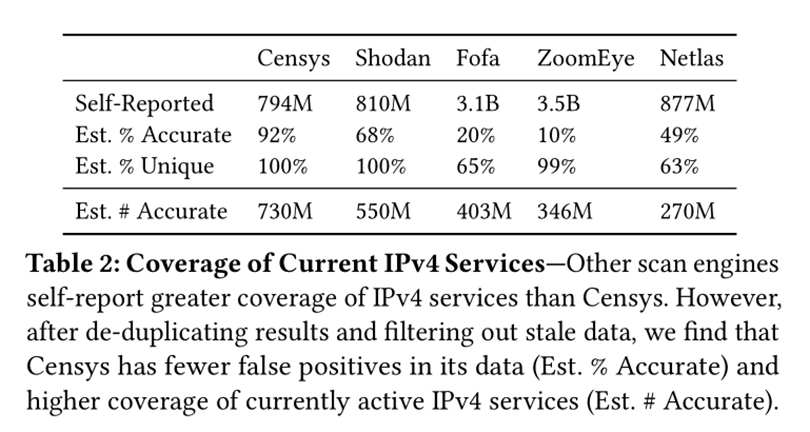 This result is significant because it reveals that in security operations and network research, data quality is far more important than raw quantity. For practitioners who rely on this data to respond to vulnerabilities, track threats, or assess network security, a “larger” dataset filled with stale and invalid information not only wastes valuable time but can also lead to flawed decision-making. The evaluation of Censys demonstrates that a system that prioritizes data freshness and accuracy can provide users with more reliable and actionable insights.