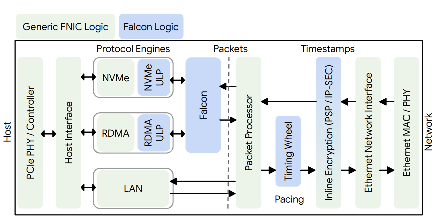 - Disaggregated Storage (NLF): When used for Near Local Flash (NLF), NVMe-over-Falcon delivers bandwidth and IOPS performance within 10% of a locally attached SSD, proving its efficacy for high-performance storage disaggregation.