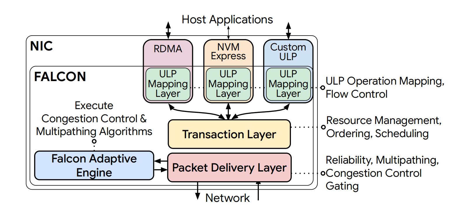 Falcon’s architecture is modular, with a clear separation of concerns into distinct layers: a ULP Mapping Layer, a Transaction Layer (TL), and a Packet Delivery Layer (PDL). This layered approach is a core design principle that manages hardware complexity and promotes extensibility.