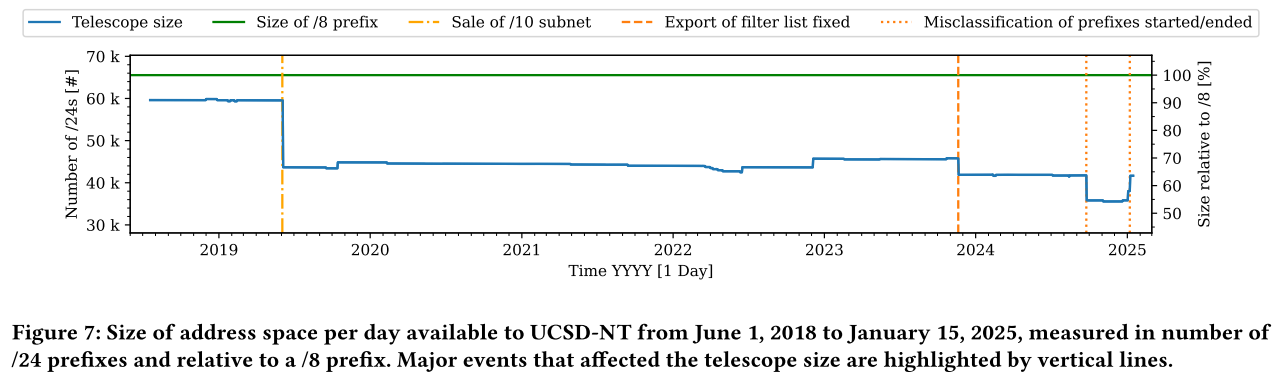 - Longitudinal study: They track UCSD-NT’s size from 2018–2025, showing shrinkage due to address sales, new leases, and filter list errors. Even small changes in telescope prefixes can cause synthetic signals or alter research conclusions (e.g., QUIC backscatter observations).