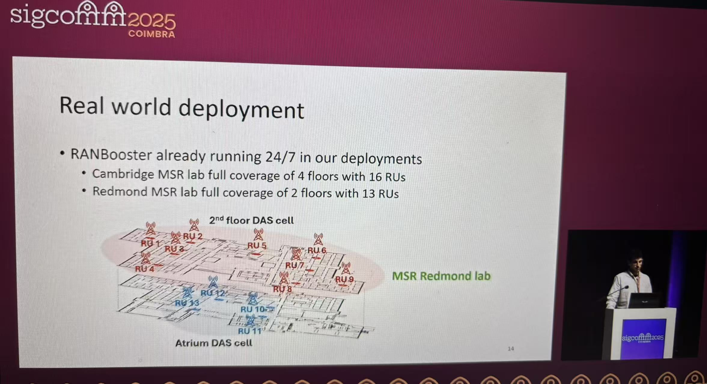 The experimental evaluation of RANBooster on the enterprise-level 5G testbeds (covering five floors of the Cambridge campus of Microsoft Research UK, multiple Foxconn O-RAN RU and three RAN architectures of srsRAN, CapGemini, and Radisys) shows that its four reference applications are all correct and effective: The DAS middleware can extend the signal of a single cell to five floors, allowing all ues to access normally and maintaining the same throughput as the baseline of a single RU. The dMIMO middleware builds a virtual RU by combining ordinary RU. When achieving Layer 2 and Layer 4 MIMO, the throughput is comparable to that of a single RU MIMO benchmark, and the UE rank indicator meets expectations. The RU sharing middleware supports two 40MHz DUs sharing 100MHz RU, and the throughput is consistent with the baseline of the dedicated 40MHz RU. The PRB utilization rate estimated by the real-time PRB monitoring middleware based on the BFP index is highly consistent with the actual value of the RAN stack MAC scheduling log. Meanwhile, this solution demonstrates multiple advantages: In terms of ease of use, the DAS middleware, which only requires basic orchestration knowledge for deployment, enables the UE to achieve approximately 700Mbps throughput across the entire floor, outperforming traditional multi-cell deployment. In terms of flexible upgrades, through the chain combination of middleware, it is possible to achieve multi-operator shared infrastructure, replace middleware to enhance performance (dMIMO’s throughput is 2-3 times higher than that of DAS), and reduce server power consumption by 41% in single-cell deployment. In terms of performance, the DAS middleware implemented by DPDK can support four rus without packet loss on a single CPU core. Adding more CPU cores can further expand it. The XDP implementation is more suitable for CPU-constrained scenarios. Moreover, all middleware can be reused without code modification under different RAN architectures, verifying its interoperability and practicality. In terms of cost, The deployment based on RANBooster reduces the cost by 41% compared to the traditional DAS solution (approximately $60,000 for the Cambridge deployment vs. $154,000 for the traditional one).