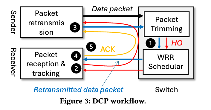 The main contribution of DCP is that, without lossless (PFC) guarantees, it provides a transport architecture for RDMA over lossy Ethernet that balances reliability and performance, is friendly to per-packet load balancing, largely avoids reliance on timeouts (RTO), and is practical to implement in hardware. However, deployability may be challenging because it requires hardware/firmware changes on both switches and RNICs (e.g., congestion-triggered header trimming and an HO control queue in switches, and HO-based fast retransmission and out-of-order direct writes at endpoints).
