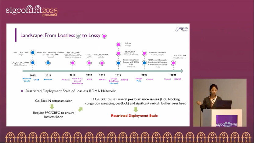RDMA is widely deployed in datacenters because it offloads the network stack to RNICs to achieve high throughput and low latency; however, traditional RNICs use Go-Back-N (GBN) for loss recovery, which causes throughput to collapse on lossy Ethernet once packets are lost. Operations often enable PFC to make Ethernet “lossless” as a workaround. PFC is coarse-grained, prone to head-of-line blocking, pause/congestion storms, and deadlocks, and imposes strict distance constraints, significantly increasing operational complexity and risk. These limitations motivate the community to explore efficient RDMA over lossy networks without PFC.