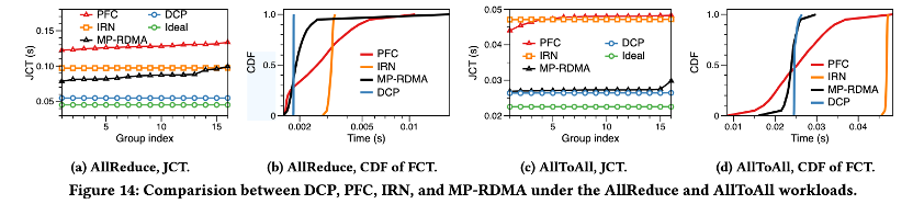 For AllReduce, DCP’s JCT is on average lower by 38% / 44% / 61% compared to MP-RDMA / IRN / PFC; for All-to-All it is 5% / 45% / 46% lower on average. Single-flow tail FCT is also best, explaining the JCT gains (the synchronization in collectives means one slow flow delays the whole job).