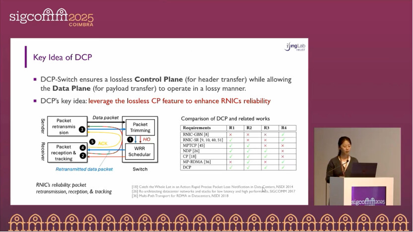The paper proposes DCP, a transport architecture co-designed between switches and RNICs. On the switch side, a lossless control plane is provided: under congestion, the switch trims packets to header-only (HO) and reliably forwards HO packets. Endpoints use HO notifications to enable header-driven, fast and precise retransmission, and adopt message-level counting without bitmaps for out-of-order reception and state tracking. Prototypes on P4 switches and FPGA RNICs demonstrate, under real and large-scale workloads, performance improvements of about 1.6× / 2.1× over state-of-the-art lossless/lossy baselines (mechanisms and details are discussed later).
