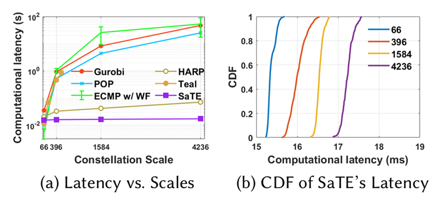 The authors evaluate SaTE on large-scale simulations of the Starlink constellation with 4,236 satellites, and the results are striking. SaTE achieves a computation latency of just 17 ms, representing a 2738× speedup over commercial solvers. In terms of throughput, it is able to satisfy at least 11% more traffic demand, with an average improvement of 23.5% compared to state-of-the-art methods. Moreover, SaTE demonstrates strong generalizability, successfully adapting to unseen topologies and scales while outperforming both heuristic and learning-based baselines. These findings are significant because they show that real-time traffic engineering is not only feasible in highly dynamic satellite networks but also capable of overcoming the limitations of existing approaches, thereby paving the way for scalable and efficient satellite internet systems.