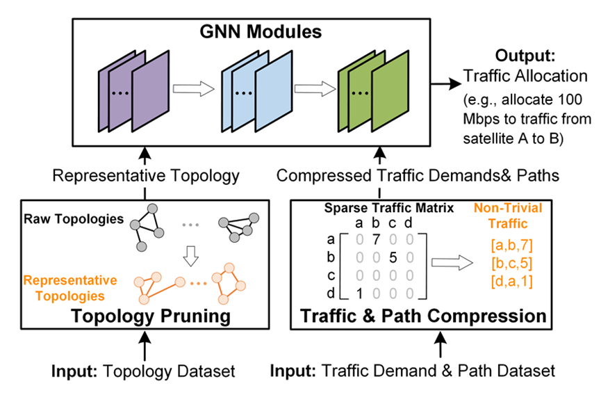 The authors propose SaTE, a low-latency traffic engineering algorithm tailored for dynamic satellite constellations. The key idea is to model the TE problem using a heterogeneous graph representation that captures satellites, traffic demands, paths, and inter-satellite links. Unlike prior works that require additional DNN layers, SaTE uses only Graph Neural Networks (GNNs), enabling generalization to unseen topologies without retraining.